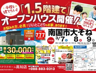 【高知市朝倉|モデルハウス内覧即売会】家賃並みの感覚で家が持てる!(3/14~16)